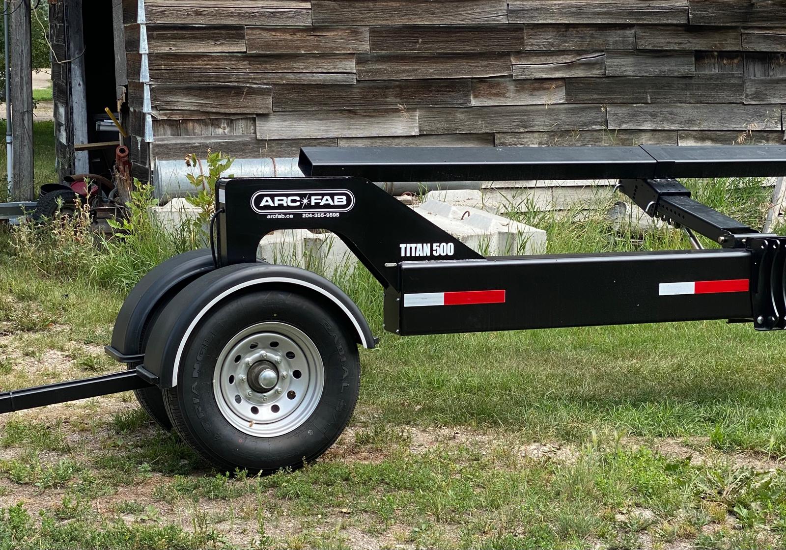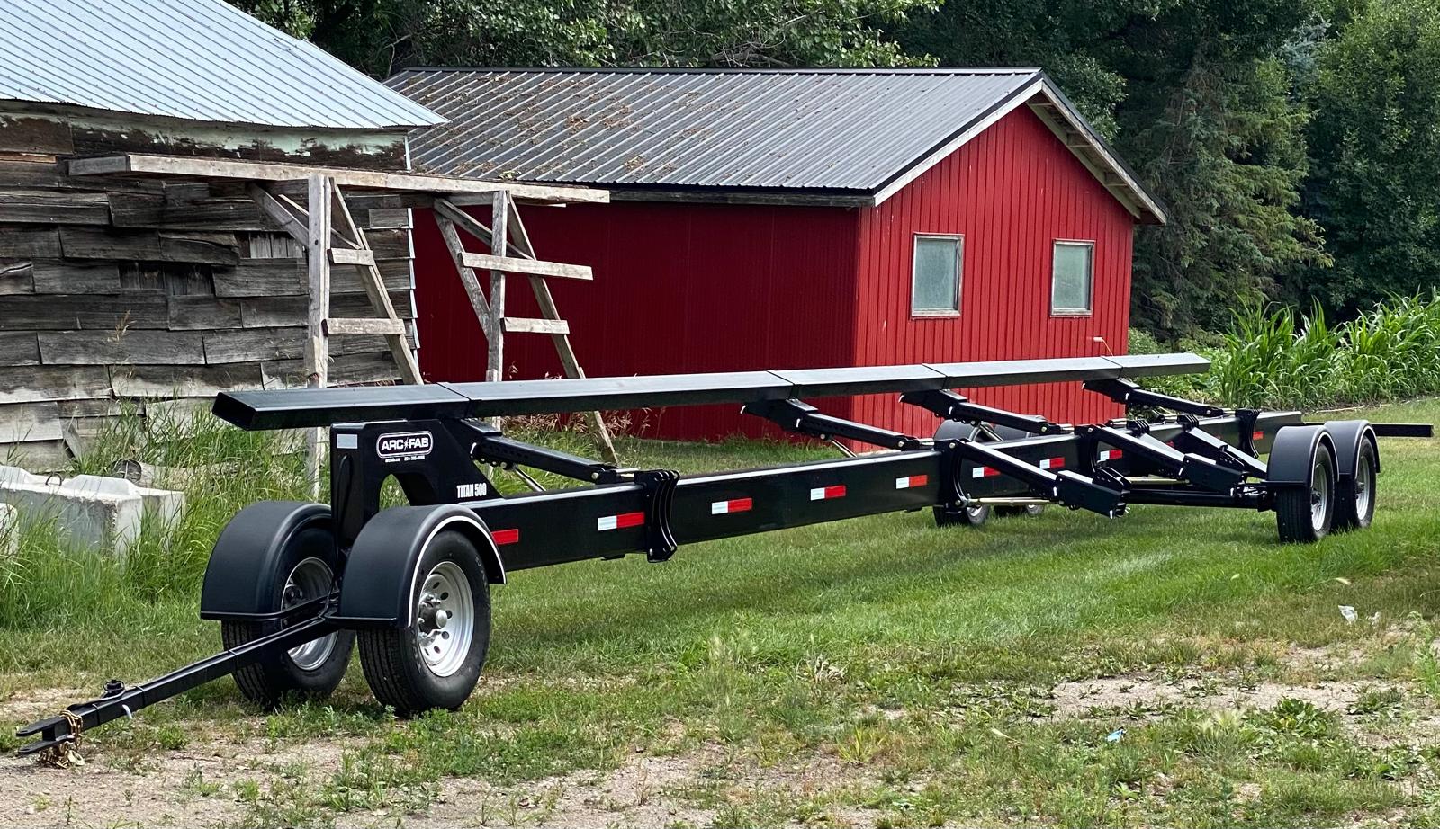 Focused on the latest hinged draper headers, the Titan 500 comes equipped with tandem 8k torsion brake axles at the back and a torsion dolly at the front with 8 bolt hubs all around.