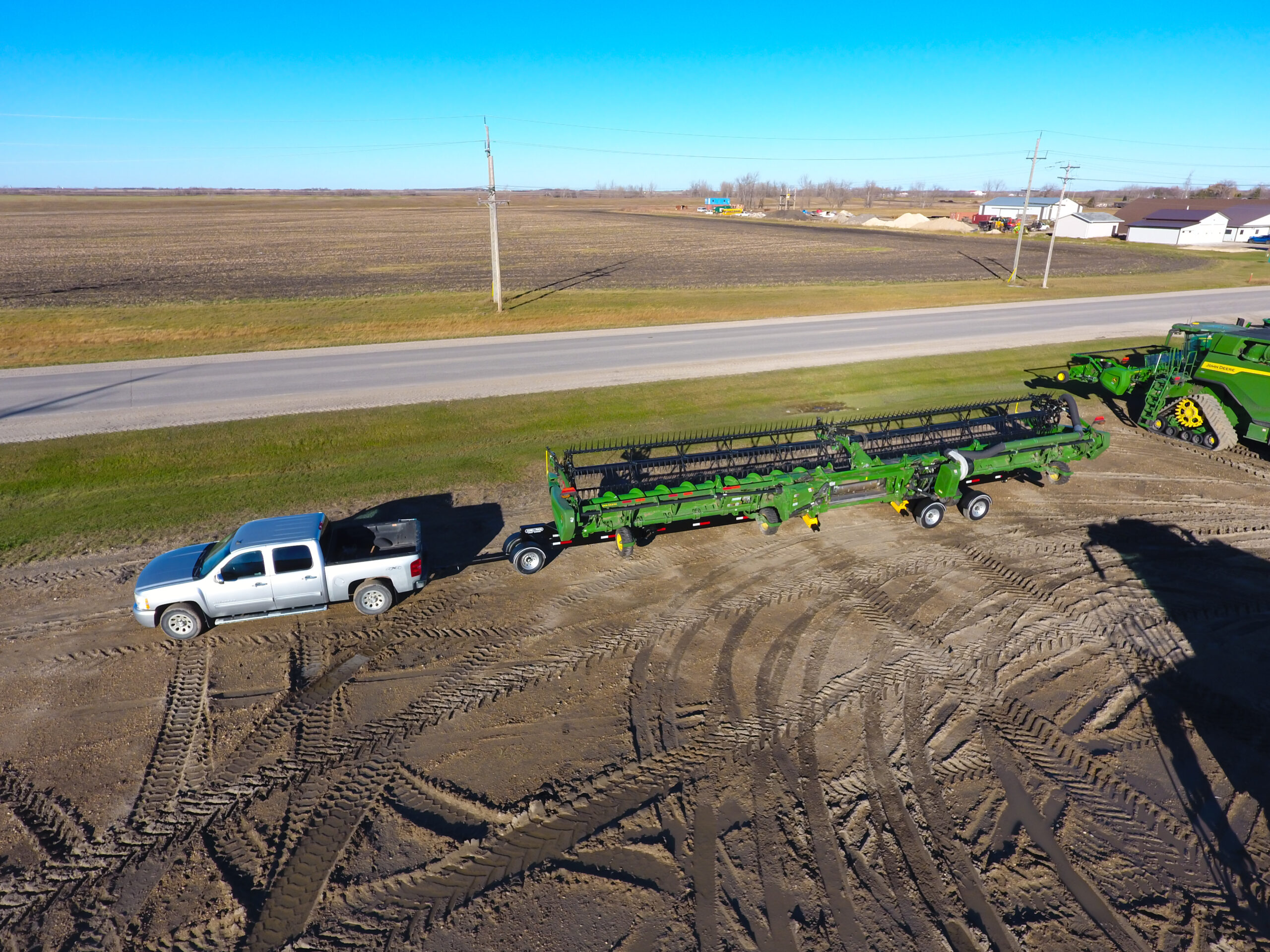 It works great for smaller header, and is often used for storage, but has highway rated tires, and can haul your header between field and yard.